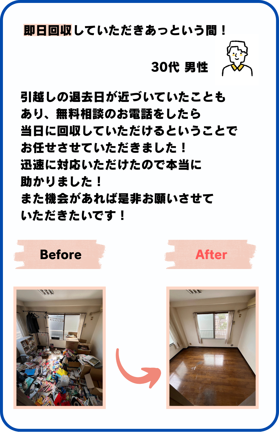 お部屋からの運び出し作業・現地までの出張費・ゴミの処分費などは全て0円です。
