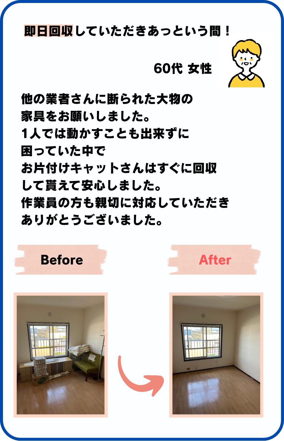 お部屋からの運び出し作業・現地までの出張費・ゴミの処分費などは全て0円です。
